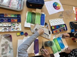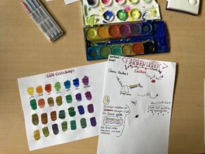 Bei der anschließenden Arbeit mit dem Tuschkasten wurde schnell klar, dass hier andere Regeln gelten als bei Licht: Beim Mischen von Farben entsteht kein Weiß, sondern meist ein trübes Grau-Braun. Durch intensives Experimentieren fanden die Schüler*innen heraus, dass es drei nicht mischbare Farben gibt: Cyan, Magenta und Gelb. Diese wurden als Primärfarben festgelegt, da sich aus ihnen alle anderen Farben mischen lassen. Der klassische Farbkreis von Johannes Itten wurde dabei kritisch hinterfragt und praktisch angepasst.