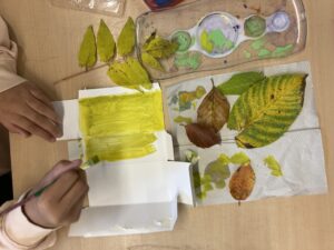Wir mischten Fantasiefarben, aber auch Hautfarben, Haarfarben, Sweatshirtfarben, Wandfarben, Tischfarben und Farben von gesammelten Herbstblättern, Ästen, Steinen und Beeren. Dabei versuchten wir, mit nur drei Grundfarben den exakten Farbton zu treffen – gar nicht so leicht! Wusstest du, dass in einem grünen Blatt nicht nur Gelb und Cyanblau stecken, sondern meistens auch ein bisschen Magentarot?