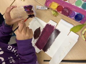 Zuerst haben wir uns gefragt, was Farbe eigentlich bedeutet und ob eine Banane wirklich gelb ist. Nach Experimenten mit Licht und Prismen haben wir gelernt, dass in weißem Licht alle Regenbogenfarben stecken und aus allen Regenbogenfarben wieder weiß wird. Doch in Kunst arbeiten wir nicht mit Licht, sondern mit unserem Tuschkasten, und da ergeben alle Farben zusammen kein Weiß, sondern eher ein matschiges Grau-Braun.