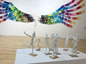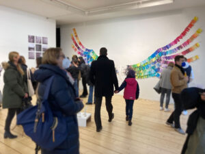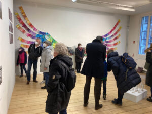 Zur Vernissage füllten sich die Ausstellungsräume schnell mit zahlreichen Besucher*innen. Zwischen den gezeigten Arbeiten war der riesige, bunte Corona-Phoenix ein echter Hingucker: Viele Menschen blieben stehen, betrachten die farbigen Federn, kamen ins Gespräch und ließen sich mit den ausladenden Flügeln fotografieren.