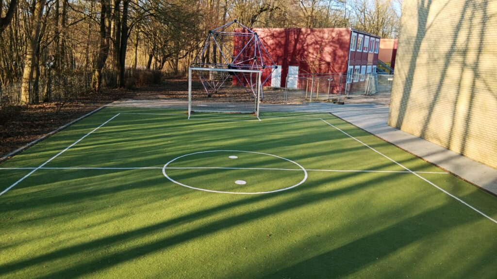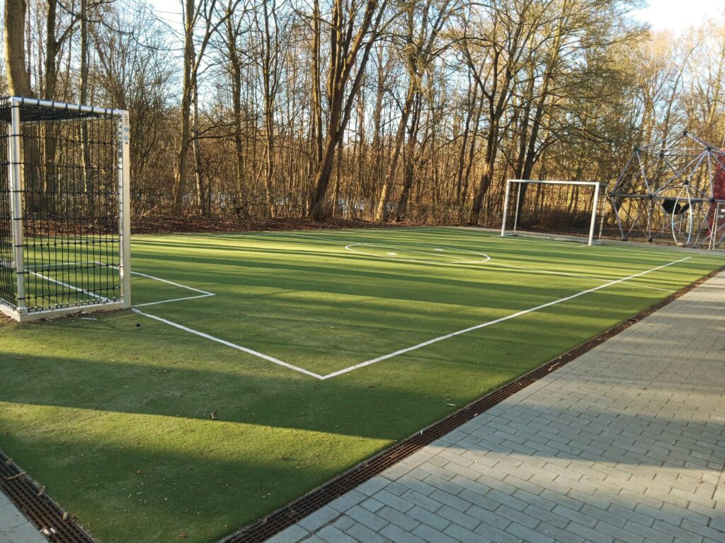 Unsere Schule hat tolle Neuigkeiten: Wir haben einen neuen Fußballplatz und einen Basketballplatz bekommen!
