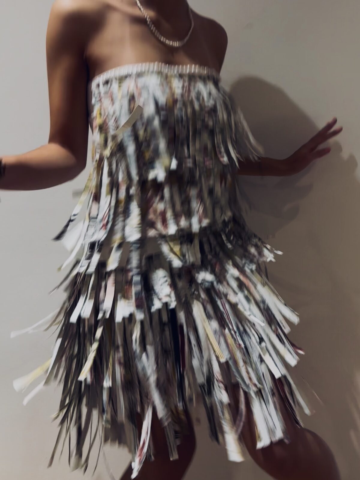 Anschließend wurden die entworfenen Stücke in Fotos inszeniert, sodass die künstlerischen Ideen in einer Bildkomposition stehen. Am Ende entstand eine Sammlung kreativer Papierkleidungsstücke, die in Fotos festgehalten wurden.