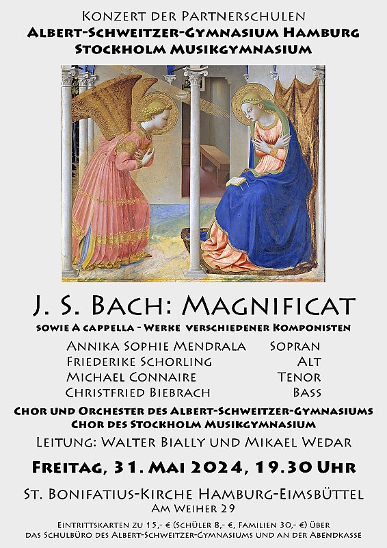 Vom 27. bis 31. Mai werden wieder 60 Schülerinnen und Schüler unserer Partnerschule, dem Stockholmer Musikgymnasium Kungsholmen am ASG zu Gast sein. Zusammen mit unserem Schulchor sowie einem überwiegend aus ASG-Schülern besetzten Orchester wird ein besonderes Konzert gestaltet, in dessen Mittelpunkt J.S. Bachs „Magnificat“ steht. Daneben werden acapella-Werke verschiedener Komponisten aufgeführt. Die musikalische Leitung haben Walter Bially und Mikael Wedar.