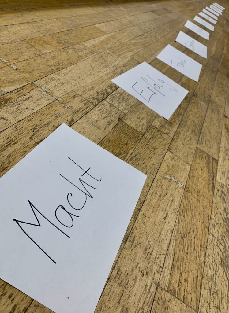 Zu Beginn lernte Frau Kampwirth uns kennen, indem wir uns einen aus mehreren Begriffen aussuchten und dann mit einem Ballspiel unsere Namen nannten sowie unseren Begriff und warum wir genau diesen gewählt hatten. Dadurch entstanden erste persönliche Eindrücke und mir wurden unterschiedliche Perspektiven deutlich. Anschließend folgten Übungen mit offenen Satzanfängen, die wir spontan vervollständigen sollten. Dadurch entstanden sehr persönliche Aussagen, die mir weitere interessante Einblicke in die Gedanken und Haltungen meiner Mitschüler*innen ermöglichten.